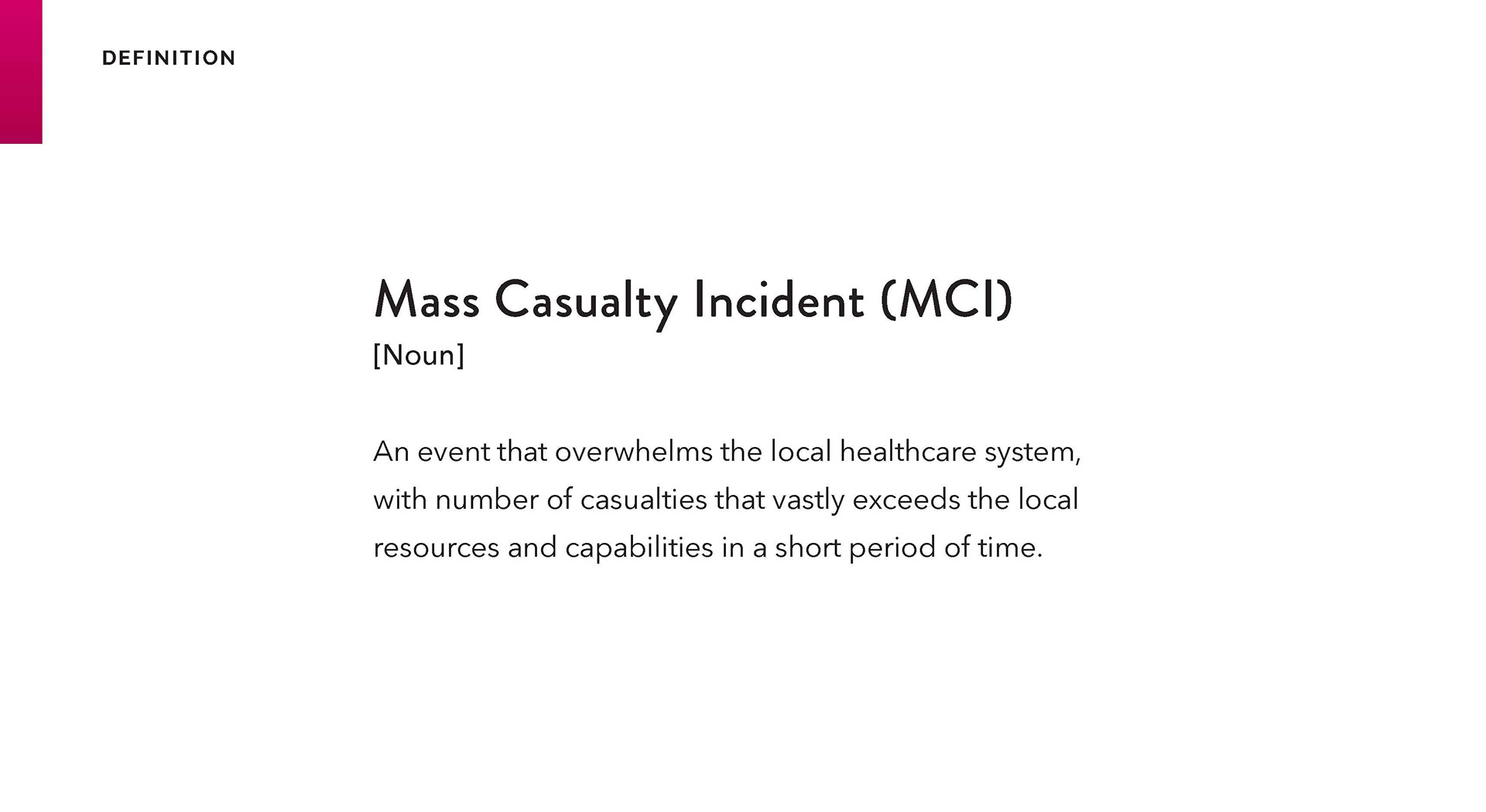 MCI scenarios could include auto accidents, plane or train crashes, bombings, mass shootings, or chemical leaks/explosions.